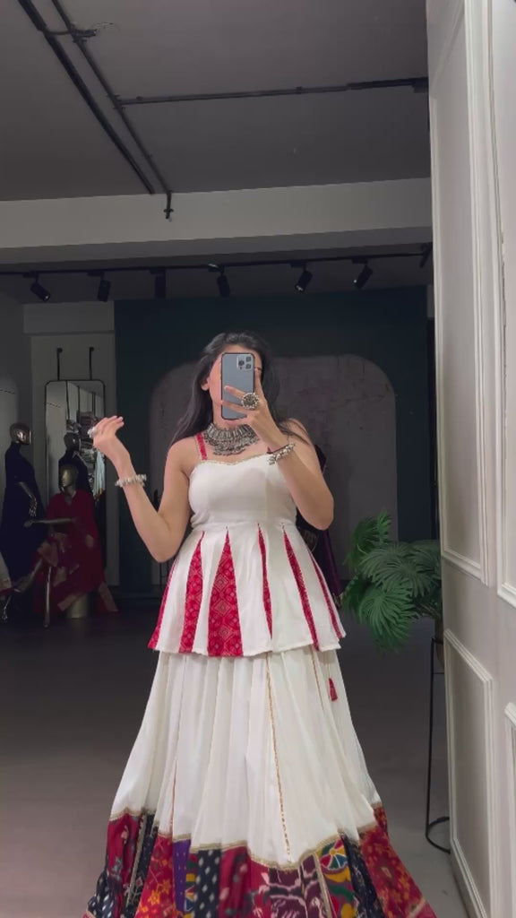 This Navratri, step out in style with a white rayon lehenga beautifully crafted with multi-color patch work, bandhani prints and traditional designs🪷